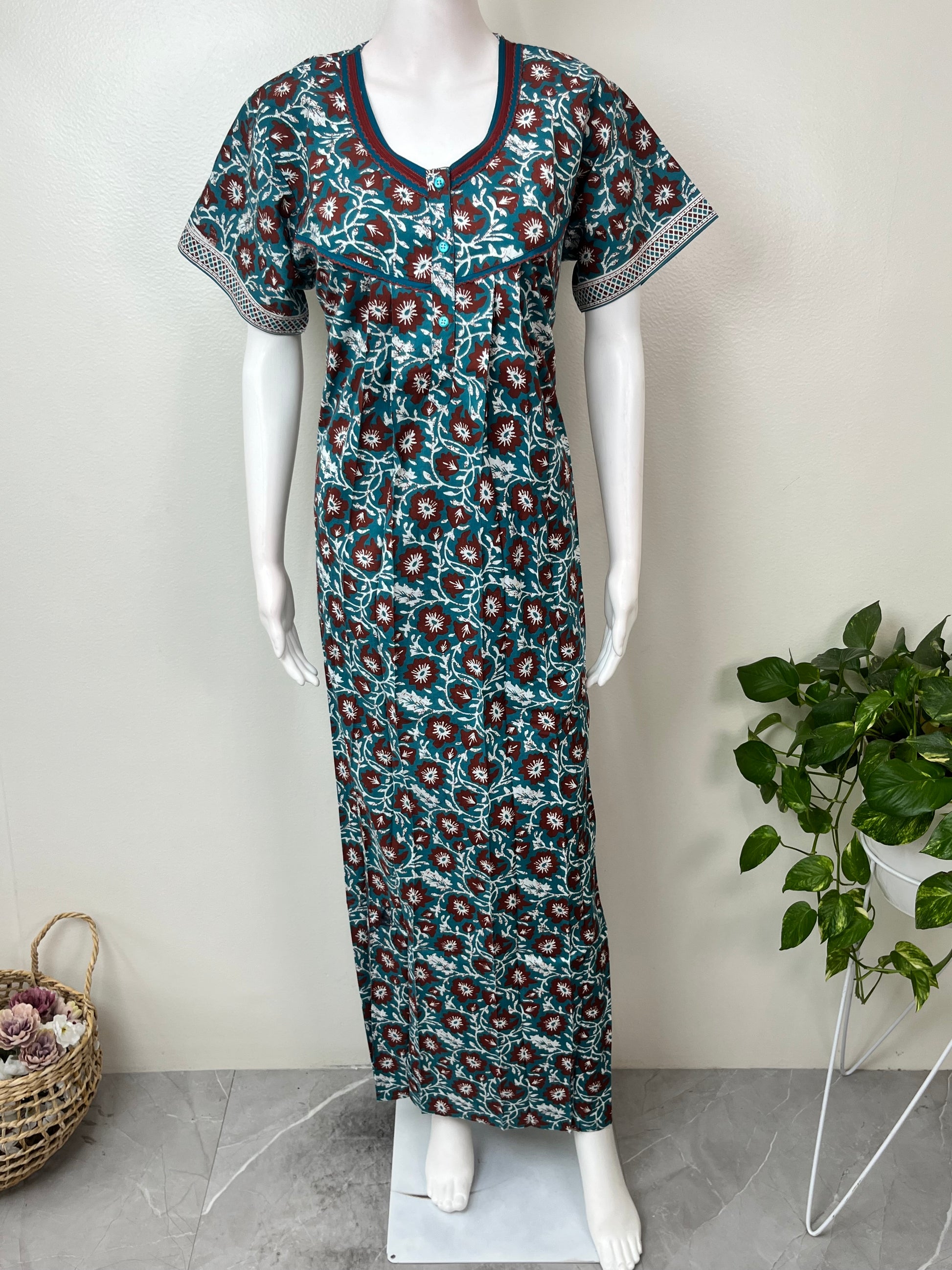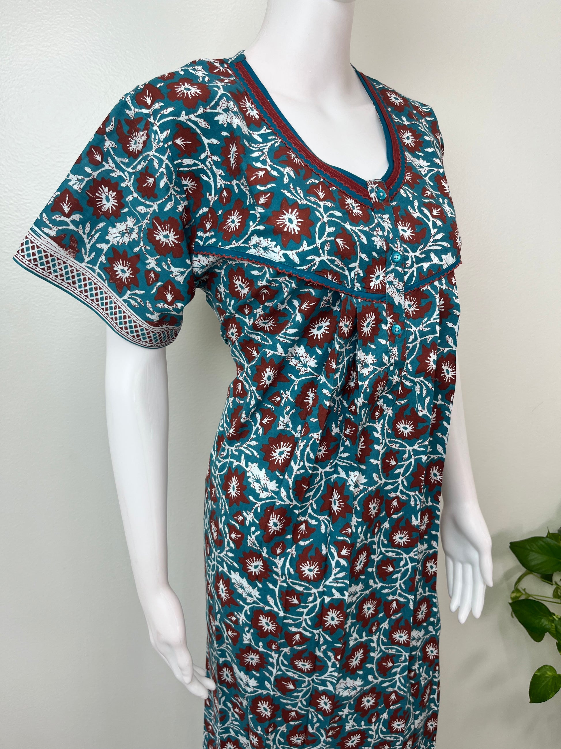 Blue Pure Cotton Nighty with Contrast Print