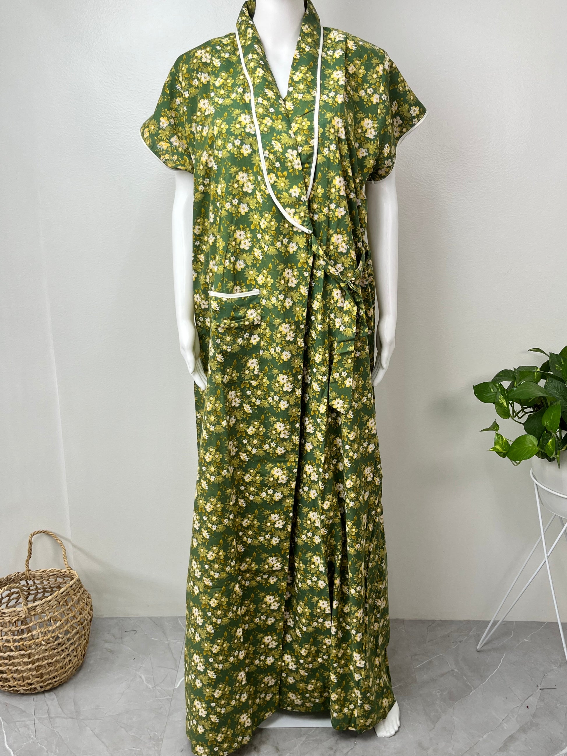 Comes with a sleeveless inner nighty. Jacket features a front tie and contrast piping for a neat, elegant look.